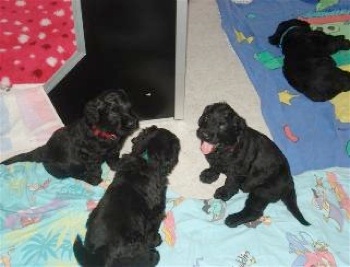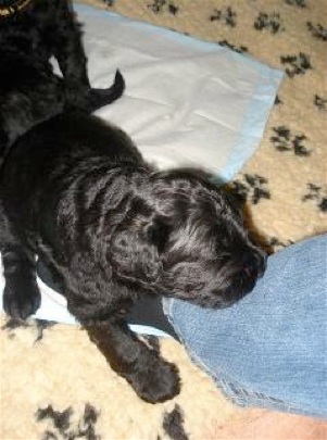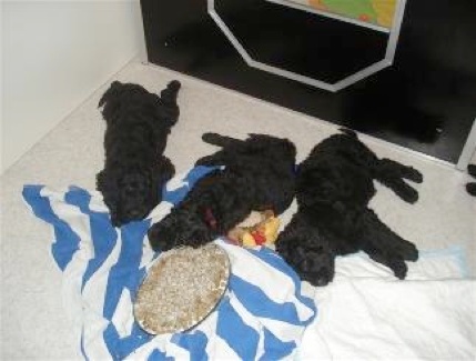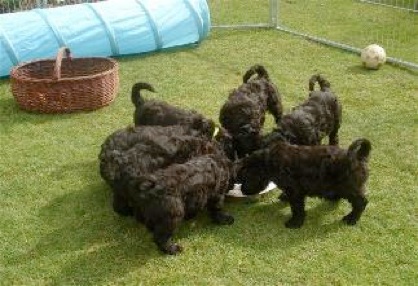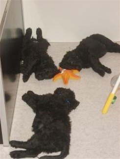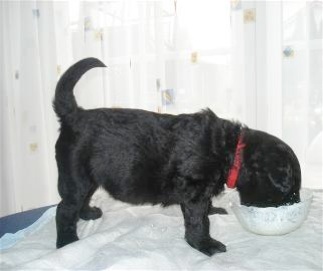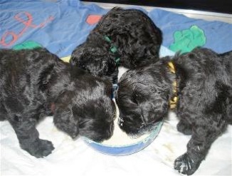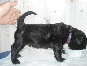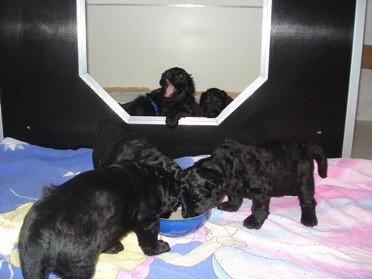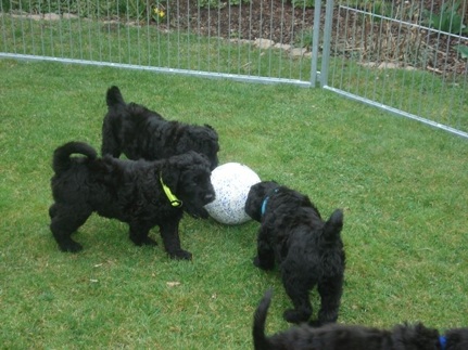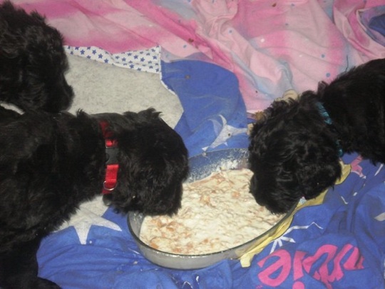 Die Welpen haben einen riesigen Hunger und schlecken ihre kleinen Schüsselchen leer. Sie tragen nun ihre kleine Kämpfe miteinander aus und machen mit ihren kleinen spitzen Zähnchen auch vor meinen Händen und Füßen keinen halt. Manchmal ist ihre Spielfreude so groß, das sie versuchen an mir "hoch zu klettern" und dabei werde ich angeknurrt und dann beißen sie und zerren an meinen Hosenbeinen. Ich hoffe das ich den kleinen Quälgeistern das noch austreiben kann!