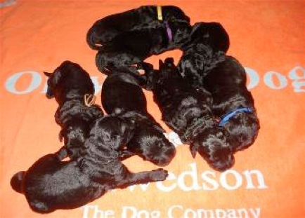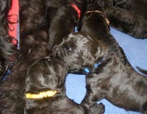 Kaum war der Rüde "Blau" zum trinken gekommen, kam auch schon der Rüde "Lila" zur Welt. Leia versorgte auch diesen liebevoll, während die anderen beiden noch am Saugen waren. Danach kamen kurz hintereinander die Hündinnen "Rot" und "Türkis" zur Welt. Dazwischen himmelte Leia immer wieder kurz den Fritz an, wenn er die Welpen wog und mit versorgte. Die ersten 5 neugeborenen Welpen waren kaum, von der Geburt und Trinken erschöpft eingeschlafen, als nach einige Zeit die Brüder "Braun", "Grün" und "Bordeaux" nacheinander, pünktlichst im 20 Minuten Takt das Licht der Welt erblickten. Rüde "Gelb" ließ sich dann nochmal richtig Zeit (1 Std) und als er endlich da war nahm er den Rückwärtsgang und wollte wieder zurück, von wo er herkam! Immer wieder robbte er dahin zurück bis er auf die wohlriechende Milchbar aufmerksam gemacht wurde und zum bleiben überredet wurde!!!