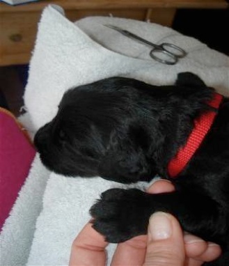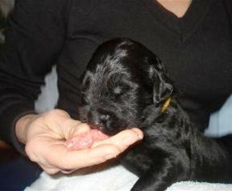 Nun sind die Welpen eine Woche alt und ich bin mit der Entwicklung und dem Gewicht sehr zu frieden. Mehr wie Schlafen, Rumrobben und Quietschen wenn etwas nicht in Ordnung ist machen sie im Moment nicht. Rüde "Gelb" verläßt seinen Stammplatz bei Mamas Rute oft nur zum trinken, damit sein Fluchtweg zurück immer da ist.
