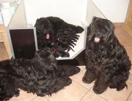 Leia hatte schon am Vortag die ersten Anzeichen einer beginnenden Geburt bzw. Wehen gezeigt. Sie wollte aber nicht in die Welpenkiste steigen. Nur mit "gut zureden" legte sie sich für einige Minuten hinein. Immer wieder lief sie zur Haustür, als ob sie dort auf jemanden warten würde. Da mein Mann und unser Dennis bei der Siegerehrung auf der Kartmesse waren, ahnte ich schon das Leia bestimmt auf ihr Herrchen warten wollte. Dazu muss man sagen, dass Leia den Fritz über alles liebt und wenn er zu Hause ist, weicht sie keinen Pfötchen von ihm weg!!! So zog sich alles hin und erst als meine zwei Männer um 02.30 Uhr Nachts auf Sonntag heim gekommen sind, konnte es mit der Geburt von Leia´s Welpen losgehen!