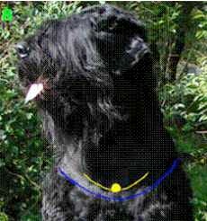 In blau - die ungefähre Linie, welche zum Schneiden des Nackens benützt werden sollte (genannt Hemdbrust oder auch Tuxedo Form).