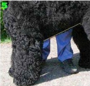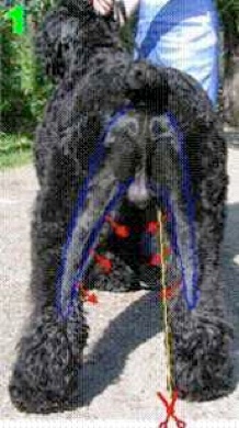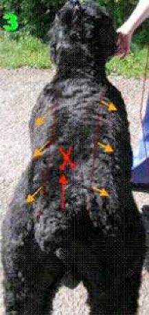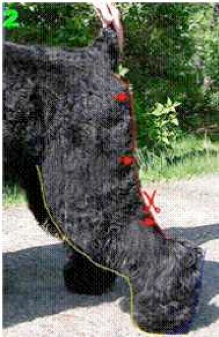 Der Schweif - der ganze Schweif sollte ebenmäßig bis zu einer länge von 5-6 cm geschnitten werden. Der Schweif sollte den Körper ergänzen und nicht unproportioniert aussehen. Der Schweif sollte allseitig dick und kräftig sein. Der Schweif zeigt die Knochenstruktur eines SRT. Wenn der Schweif dick ist, dann ist die Knochenstruktur korrekt und schwer. Darum sollte das Haar am Schweif nicht kurz geschnitten werden. Wenn der Schweif zu kurz geraten ist, belassen Sie etwas mehr Haare am Ende, damit er länger aussieht.