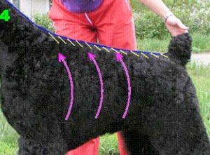 In rot Abgrenzen des Hinterteils von der hinteren Seite der Beinlinie. Mischen des langen Haares auf dem Hinterteil (8-10 cm) mit dem rasierten Haar (blaue Farbe auf Bild #1). Bürsten Sie das Haar nach hinten, in Richtung der roten Pfeile, und bilden Sie, wie auf dem Bild gezeigt, schöne kurvige Linien, indem Sie mit der Schere von unten nach oben schneiden und so die Winkelbildung des hinteren Beines betonen.