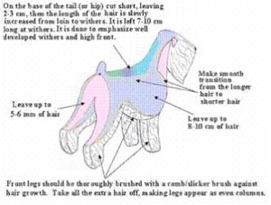 Schneiden sie die Haare an der Hüfte kurz, indem Sie 2-3 cm stehen lassen, dann verringern sie es langsam von der Rippen zum Widerrist. Belassen Sie es am Widerrist 7-10 cm lang. Somit heben Sie einen wohlgeformten Widerrist und eine hohe Vorderseite hervor.
